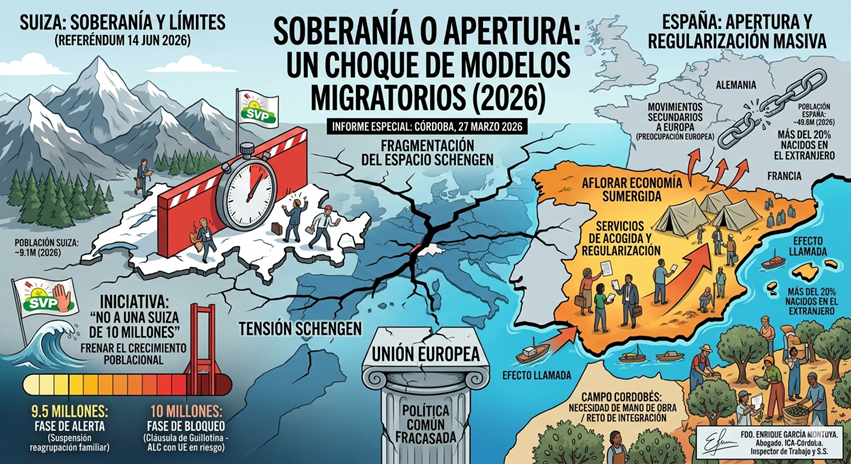 Mientras unos países (como Suiza) defienden su derecho a existir como naciones soberanas, otros (como España) actúan como si la soberanía nacional fuera un concepto caduco. El resultado es una Europa de dos velocidades, puesto que *unos cierran filas para proteger a sus nacionales, y, *otros abren las puertas de par en par y luego piden que el resto pague las consecuencias.