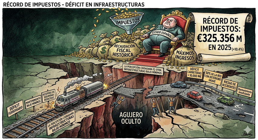 España nunca había recaudado tanto dinero en impuestos como ahora. En 2025, los ingresos tributarios alcanzaron los 325.356 millones de euros, un 10,4% más que el año anterior, impulsados principalmente por el IRPF (142.466 millones) y el IVA (99.532 millones). Así mismo, se dispara la deuda pública, que alcanza un máximo difícil de imaginar, de forma, que a la vista de lo que hay y lo que se ve existe un agujero oculto, que se traga todo el dinero de los ciudadanos con un destino ignoto.