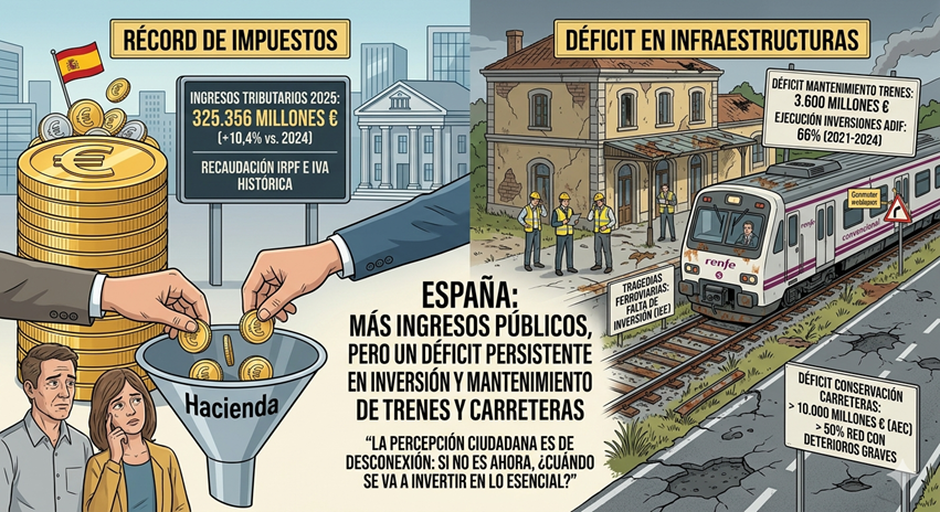 España atraviesa un momento de máximos históricos en recaudación fiscal, pero ese incremento no se traduce en una mejora equivalente de las infraestructuras. El ferrocarril y las carreteras reflejan un problema estructural: Más ingresos públicos, pero un déficit persistente en inversión y mantenimiento.